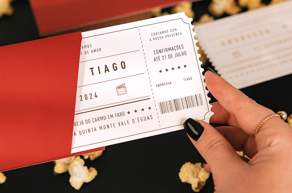 Por exemplo, se estivermos a falar de um casamento na praia, tens de garantir que elementos do oceano e da natureza não podem faltar no teu convite. Ou então, se vocês são um casal de viajantes aventureiros, podem ser criativos ao ponto de transformar o vosso convite de casamento numa espécie de bilhete de viagem, que neste caso, é a viagem do vosso amor.